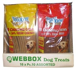 Webbox Chomping Chews are tasty, moist and meaty snacks that can be fed to your dog at any time as a treat or reward. * Webbox Chomping Chews are wheat gluten free. INGREDIENTS Contains EEC pemitted preservatives and antioxidants. TYPICAL ANALYSIS: Storage: Prior to opening should be stored in dry cool conditions, after opening store in an air tight container in dry cool conditions. Fresh drinking water should always be available