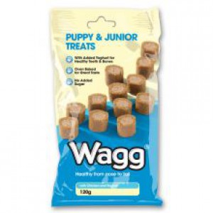 Wagg Puppy Junior Treats are the ideal treat for puppies. They can be fed from eight weeks which is great for initial puppy training and come in easily portioned rolls for regular rewards. With added calcium from yoghurt and with no added sugar and no artificial colours or flavours. Like all Wagg treats, the Puppy Junior Treats are oven baked which improves palatability and texture.